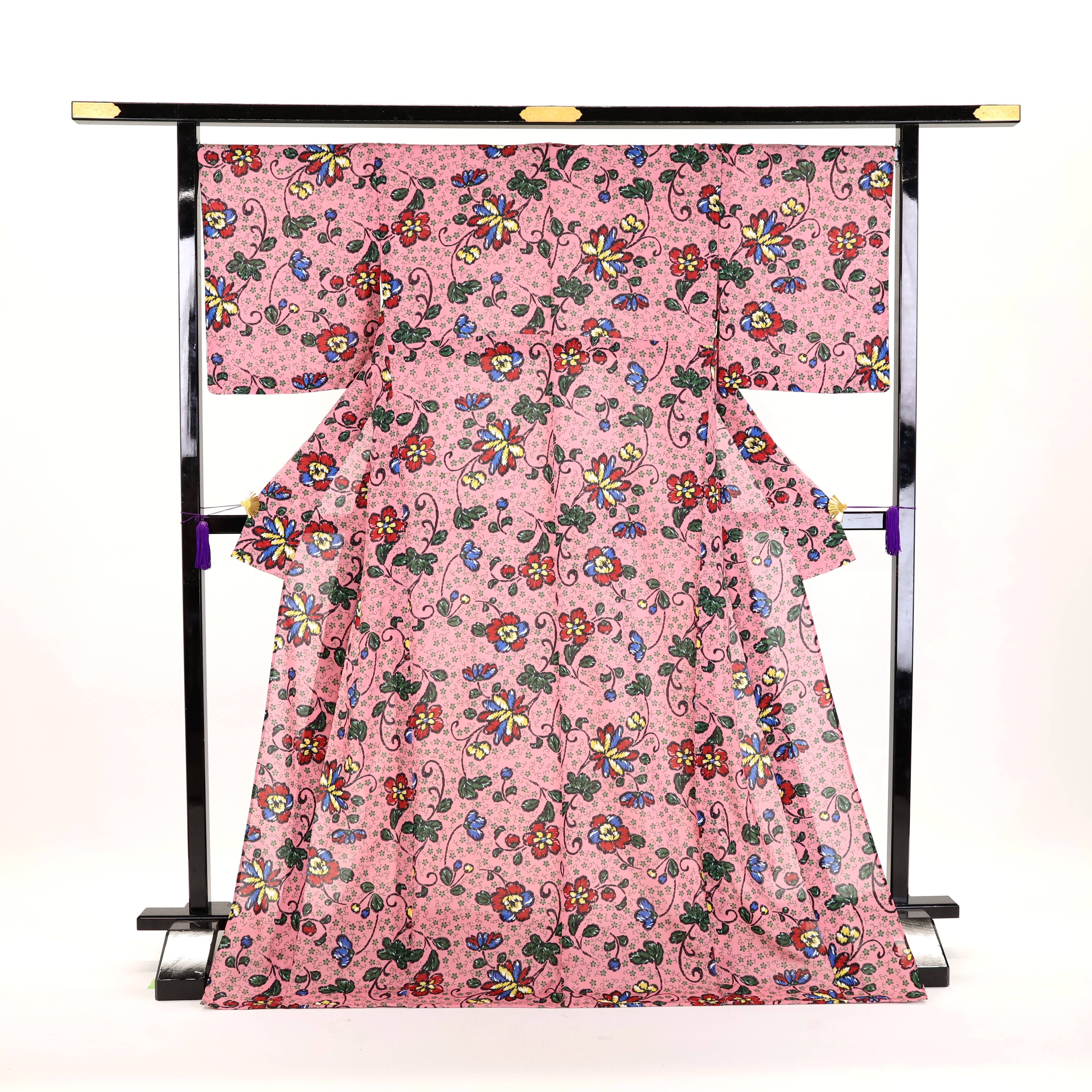 地色のピンクに、存在感のあるカラフルな花が大胆に描かれていて、レトロなポップ感がある雰囲気を醸し出すこちらのお着物。