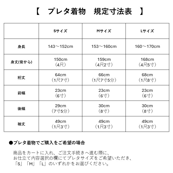 プレタ着物でご購入をご希望の場合は、カート内のお仕立て内容選択の欄にてプレタサイズをご希望いただき「S」「M」「L」のいずれかをお選びください。